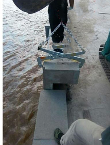由于此防護欄距離較長3公里,高度為1.2米,所需石材較多,故而使用石材吊夾替代人工上升下降起吊石材。圖中F-24石材吊夾正在吊裝石材。